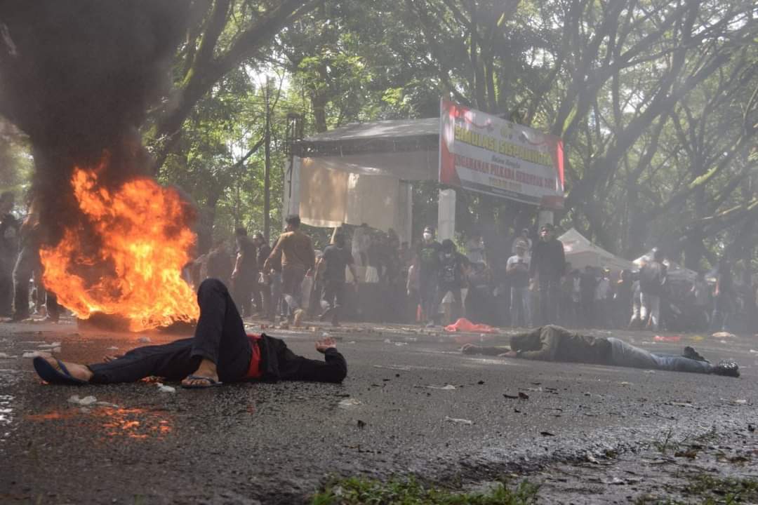Petugas pengamanan pun segera melakukan tindakan preventif dengan melepas gas air mata kepada arah massa pendemo.